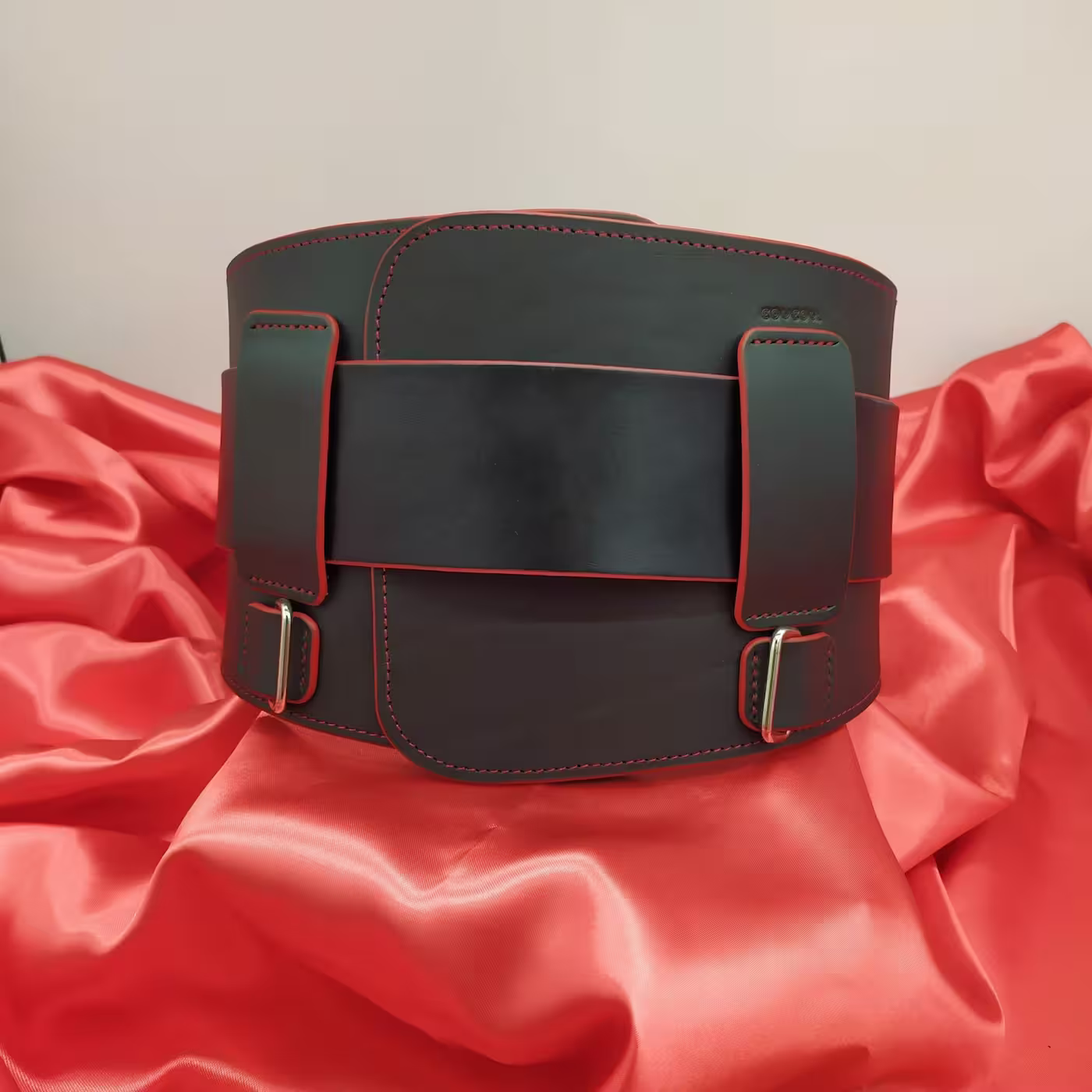 Cette ceinture large, en cuir rigide, permet à la fois un léger gainage et l’accroche de vos accessoires, menottes, sangle, etc…, grâce à ses passants métalliques.